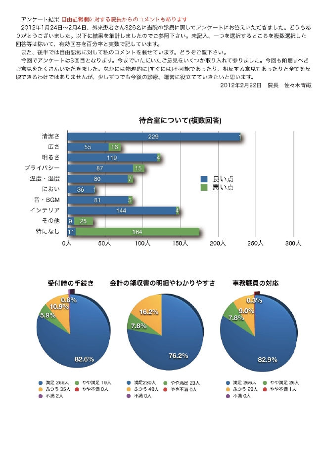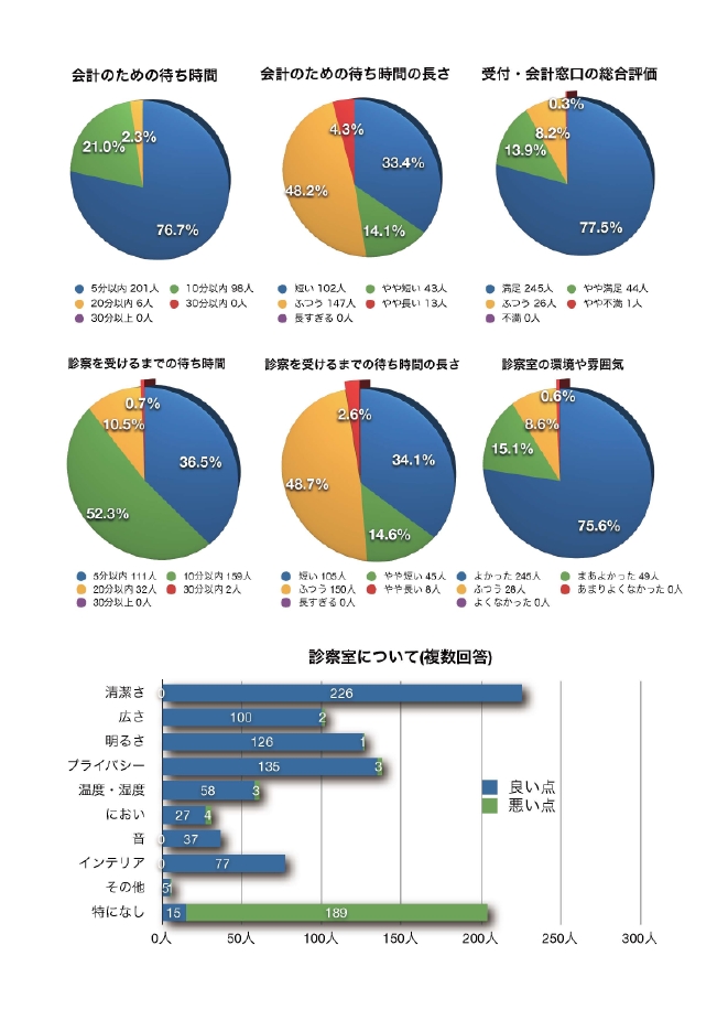 ・もっと広いところで病院をやって欲しいです。待ち時間苦しくなる時があります。待つのと人混みが苦手です。去年のアンケートの結果など取り入れて改善してくれた部分がたくさんあって嬉しいです。先生のブログとかあったら見てみたいです。いつもありがとうございます。