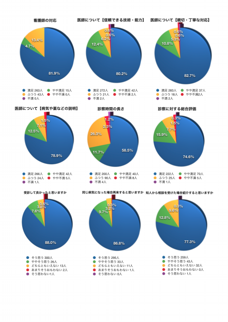 → 診察時間は医師の評価項目の中でも一番満足の頂けていないところです。私自身ももう少し時間がとれればと思うことはあります。具合の悪い方の診察時間は必然的に長くなり、ある程度必要を満たしているかとは思います。また、単位時間あたりの患者さんの数を減らせば診察時間があらかじめ長くとれますが、そうしますと多くの方の「受診希望」を満たせないことになります。現在でも新患で受診希望の方の半数以上は、予約がとれない状況なのです。(ですので、極力無断キャンセル、遅刻はしないようお願いします。他の方の受診機会を奪うことになるのです。事前に連絡をいただければそこに受診を希望される方が入ることができます)「診察時間を長くとること」と「受診機会の確保」「待ち時間」はトレードオフ(一方を追求すれば他方を犠牲にせざるを得ないという状態のこと)の関係にあるのです。その解決策としては曜日別に予約制と受付順診察(非予約制)を設定することですね。 グラフの回答では診察時間に「やや不満」「不満」の方は3.5%と少数派でした。残りの96.5%の方は「ふつう」「やや満足」「満足」と評価して下さっています。今後、アンケートで「やや不満」「不満」の方が25%を超すようであれば、火〜金のうち1日(フルタイムの4日のうち1日、これが25%に設定した理由です。50%になれば?その場合は2日にします)は予約制を廃して来院順の診療(診察時間も長いがおそらく待ち時間も長くなることが予想されます。予約制でないと2〜3時間の医療機関もあるようですね。)の導入も考慮したいと思いますが、4年間アンケートを行って「やや不満」「不満」はずっと4%前後で推移していますので多くの方が現状を肯定(やむを得ずかもしれませんが)されていると判断します。