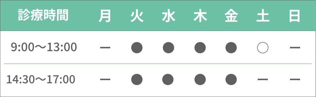 ○土曜日は9時〜12時、再診のみ。日曜・月曜・祝日は休み